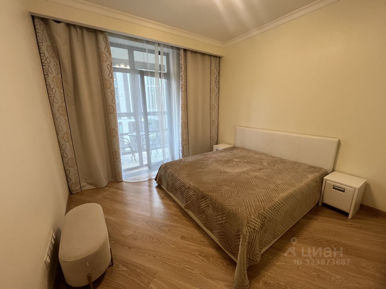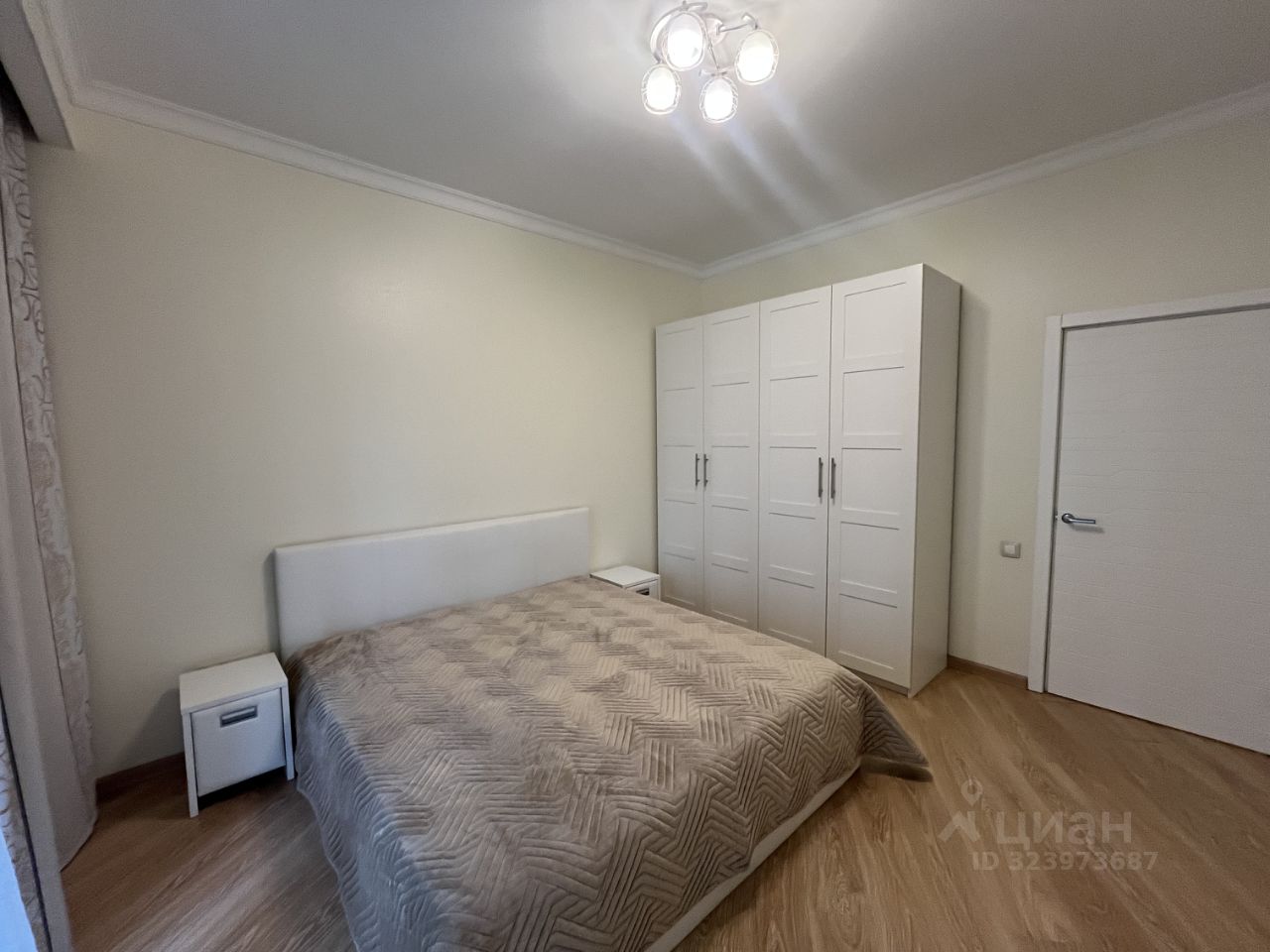 Площадь квартиры 60 метров, планировка - ОГРОМНАЯ гардеробная, просторная кухня-гостиная с раскладным диваном, спальня с кроватью шириной 2 метра и выходом на балкон с панорамным остеклением, два санузла (один - только туалет, второй - ванная, раковина и туалет).