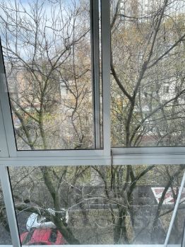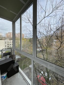 Светлый застекленный балкон с видом по двор, весной и летом прекрасный вид на зеленые деревья.