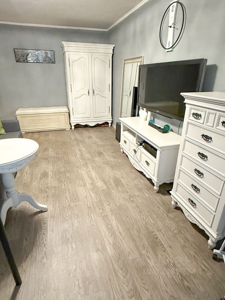 Квартира меблирована, есть диван раздвижной двуспальный, кровать, шкаф, телевизор. На кухне также есть необходимая мебель и техника, включая электро духовку, холодильник и стиральную машину. Санузел раздельный.