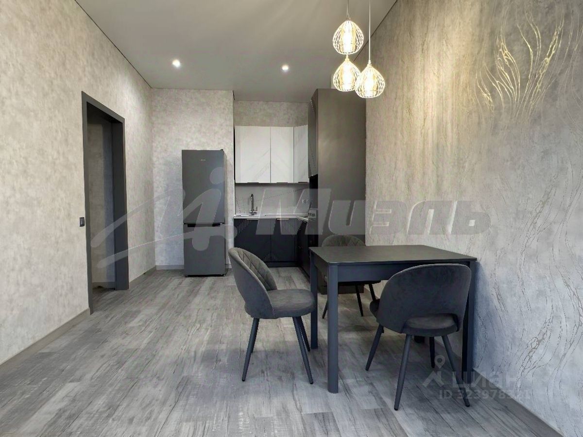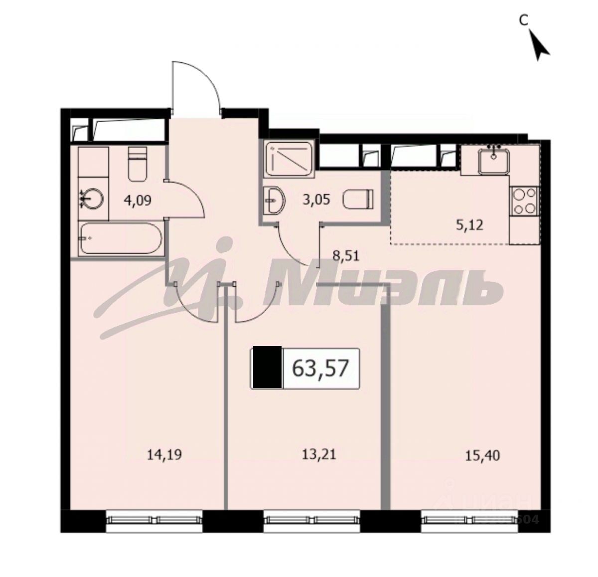 Квартира расположена на 10 этаже. Общая площадь — 63,5 м², кухня-гостиная 15,4 м².