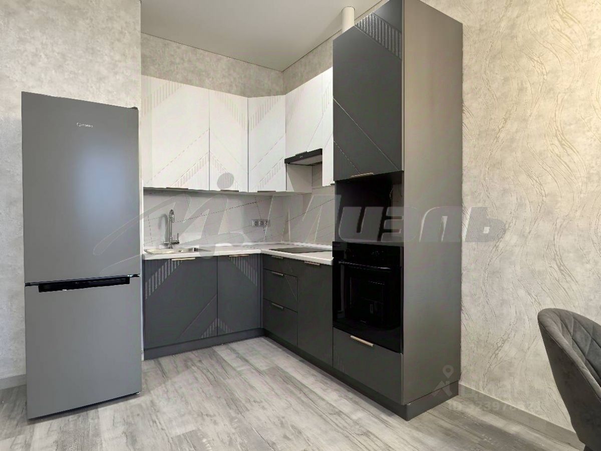 Кухня-гостиная полностью оборудована: встроенная кухня, духовой шкаф, варочная поверхность, вытяжка, холодильник и раскладной диван.