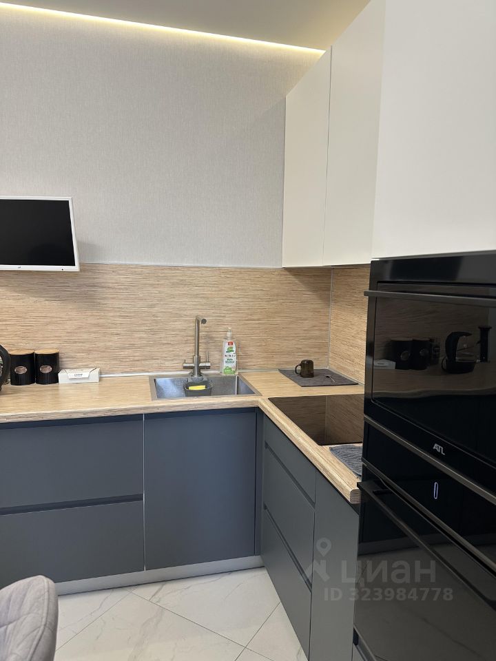 Квартира с хорошим современным ремонтом, очень чистая, укомплектована мебелью и техникой, в комнатах и на кухне телевизоры, есть кондиционер, кухонный мебельный гарнитур со встроенными варочной панелью, духовым шкафом, микроволновой печью, холодильником, есть робот-пылесос.