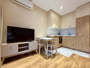 Кухня полностью укомплектована техникой (посудомоечная машинка, варочная панель, вытяжка, духовой шкаф, холодильник). Обеденный стол и два стула. В гостиной зона TV, раскладывающейся диван.
