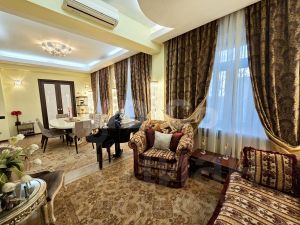 Квартира полностью укомплектована всем необходимым для комфортного проживания, вся бытовая техника и мебель в наличии, в отличном состоянии. Кухонный гарнитур со встроенной техникой, включая посудомоечную машину. Установлена система кондиционирования воздуха. Домашний кинотеатр в гостиной и спальне. Рояль Yamaha, можно играть в наушниках. Тёплый пол: санузел. Три ЖК-Телевизора. Высокоскоростной интернет.