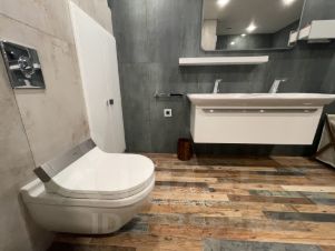 Два санузла: на 1 этаже душ, постирочная (стиральная и сушильная машины, утюг). На 2 этаже - большая ванна, унитаз-биде, раковина для двоих, полотенца и халаты.