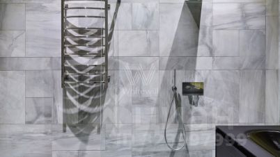 Ванная комната с самой модной в мире сантехникой Antonio Lupi из серии "раковина из чёрного стекла за миллион", наливными полами из акрила, душевой кабиной Gessi и люстрой Foscarini от дизайнеров Patricia Urquiola, оснащена прачечной с техникой Miele.