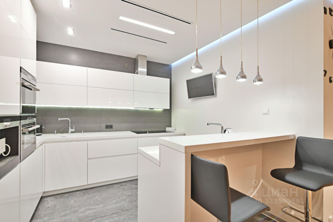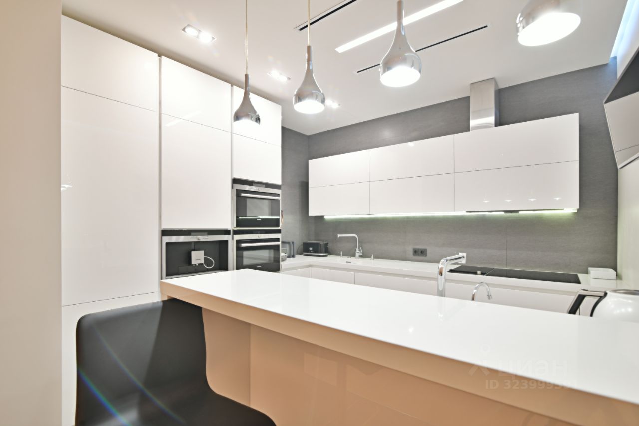 Кухня с барной стойкой, двумя раковинами (одна с измельчителем), индукцией, духовкой с микроволновкой, пароконвектоматом, кофемашиной, посудомойкой и холодильником.