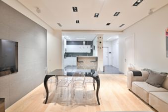 Просторная гостиная, объединённая с зоной кухни и столовой.