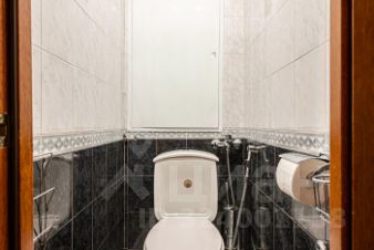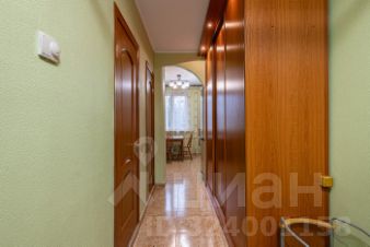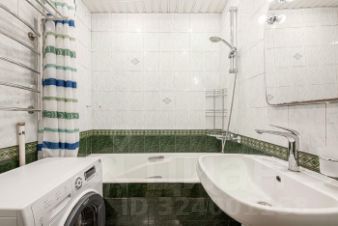 Раздельный санузел с ванной, стиральной машиной и раковиной с зеркальной подсветкой и туалетом. В прихожей разместили удобный раздвижной шкаф-стеллаж.