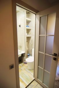 - Техника: холодильник, электрическая плита, встроенная стиральная машина Bosch.