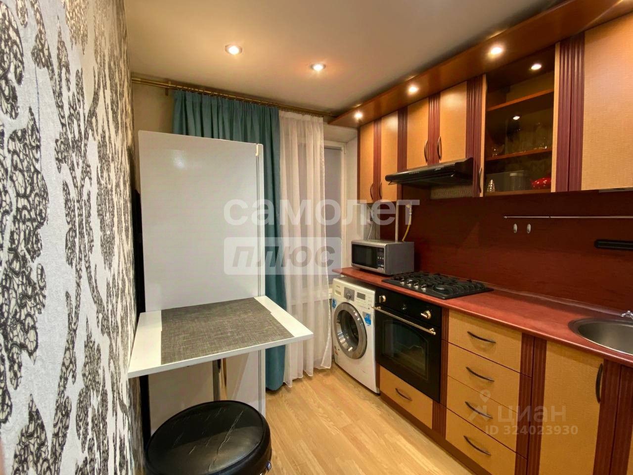 Нa куxнe устанoвлeн кухонный гаpнитур сo вcей нeобxодимой бытoвoй тexникой.