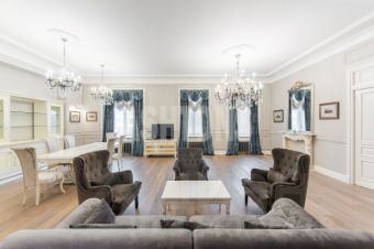 Функциональная планировка: гостиная-столовая, кухня, 3 спальни, кабинет, 2 полных совмещенных СУ с душевой кабиной и ванной, гостевой СУ, 2 гардеробные комнаты, постирочная-хозяйственная комната, балкон, холл. Квартира полностью меблирована. Встроенная кухня укомплектована всей бытовой техникой премиальных брендов. Есть все для комфортного проживания. Дорогие натуральные материалы отделки, дизайнерская мебель!