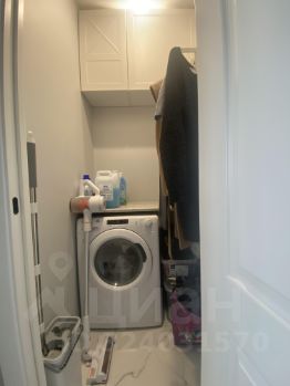 Кладовая комната: стиральная машина с сушкой, пылесос, шкафчики для хранения, штанга для верхней одежды.