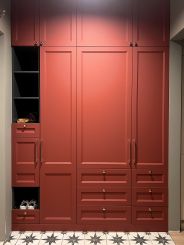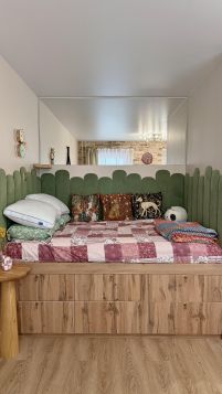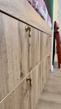 Вся мебель в студии выполнена на заказ: Кровать с ортопедическим матрасом, диван-кровать (может раздвигаться отдельными секциями). В кровати предусмотрено глубокое отделение для хранения второстепенных вещей, а также полноценный комод с антикварной латунной фурнитурой.
