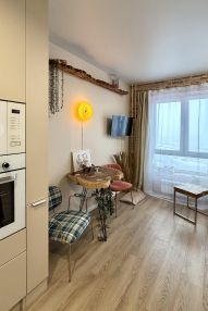 Студия функционально зонирована и оснащена всей необходимой техникой для комфортного проживания: Пылесос Dyson, телевизор, чайник, тостер, варочная панель на 3 комфорки, вытяжка. Встроенные - посудомоечная машина, СВЧ, духовой шкаф, холодильник. Стирально-сушильная машина, фен.