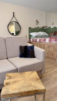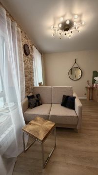 Сдается уютная студия после капитального дизайнерского ремонта: полностью изменена отделка от ПИК, внутренние стены сделаны из бетонных блоков, возведена стена для зонирования спальной и кухонной зон. Стены отштукатурены и покрашены краской высокого качества, стены можно мыть. Дверь в санузел установлена анти-вандальная, шумопоглощающая.