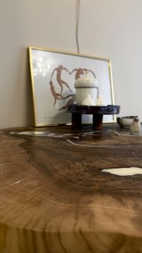 Обеденный стол выполнен из цельного ореха. Журнальные столики выполнены из спила карагача. Прикроватный стол из массива бука, Полки из дуба и капового горного тополя.