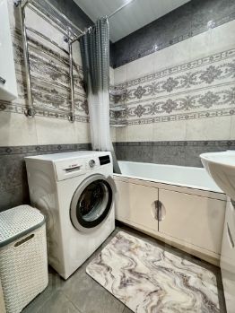 В комнатах есть вся необходимая мебель, а на кухне — современная техника: кондиционер, холодильник, посудомоечная машина, телевизор и стиральная машина.