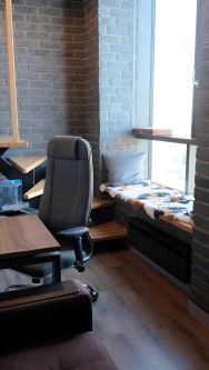 Большие окна, шторы блэкаут, деревянные жалюзи. 4 спальных места, производитель BOSS.XO Ортопедическая кровать 2,2*2,4; Удобный, комфортный, 2х местный -раскладывающийся диван, односпальное кресло. На втором этаже пентхауса просторная спальная зона, с ортопедическим матрасом New Merino- Askona. Техника Haier, Bork.
