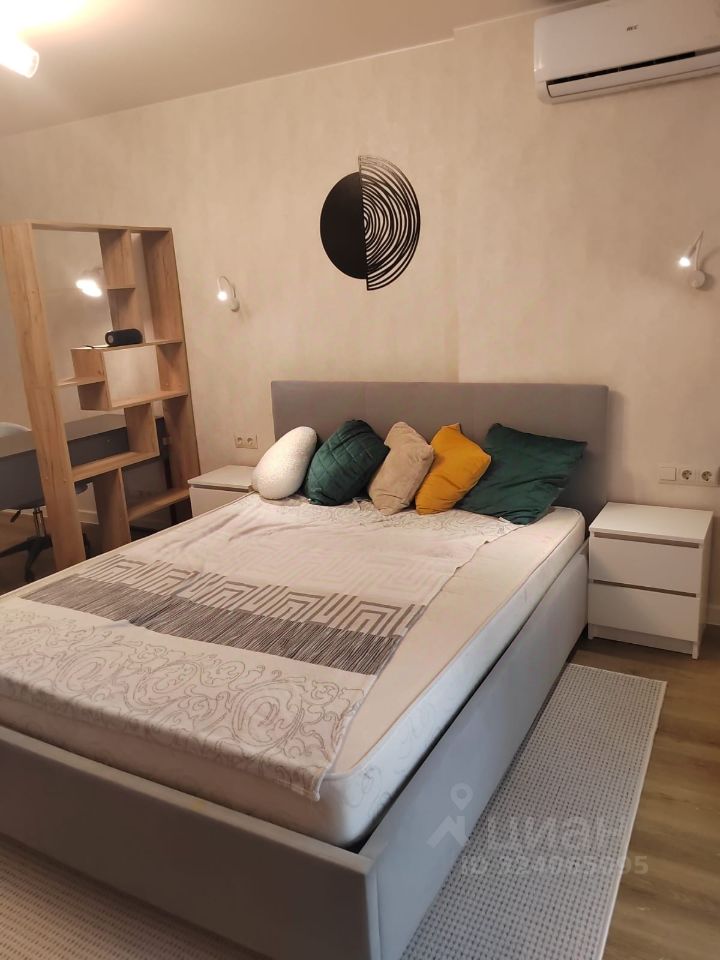 - В комнате удобная двуспальная кровать, большой зеркальный шкаф (на фото нет, будет установлен на неделе), стелаж, рабочий стол, кресло, телевизор, тумбочка, кондиционер, датчики умного дома Сбер.