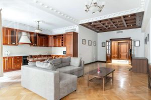 Планировка: просторная кухня-гостиная с обеденной зоной, спальня, жилая комната (можно использовать как спальню или кабинет), два совмещенных санузла с ванной и душевой кабиной, постирочная, прихожая. Квартира частично меблирована, укомплектована необходимой бытовой техникой.