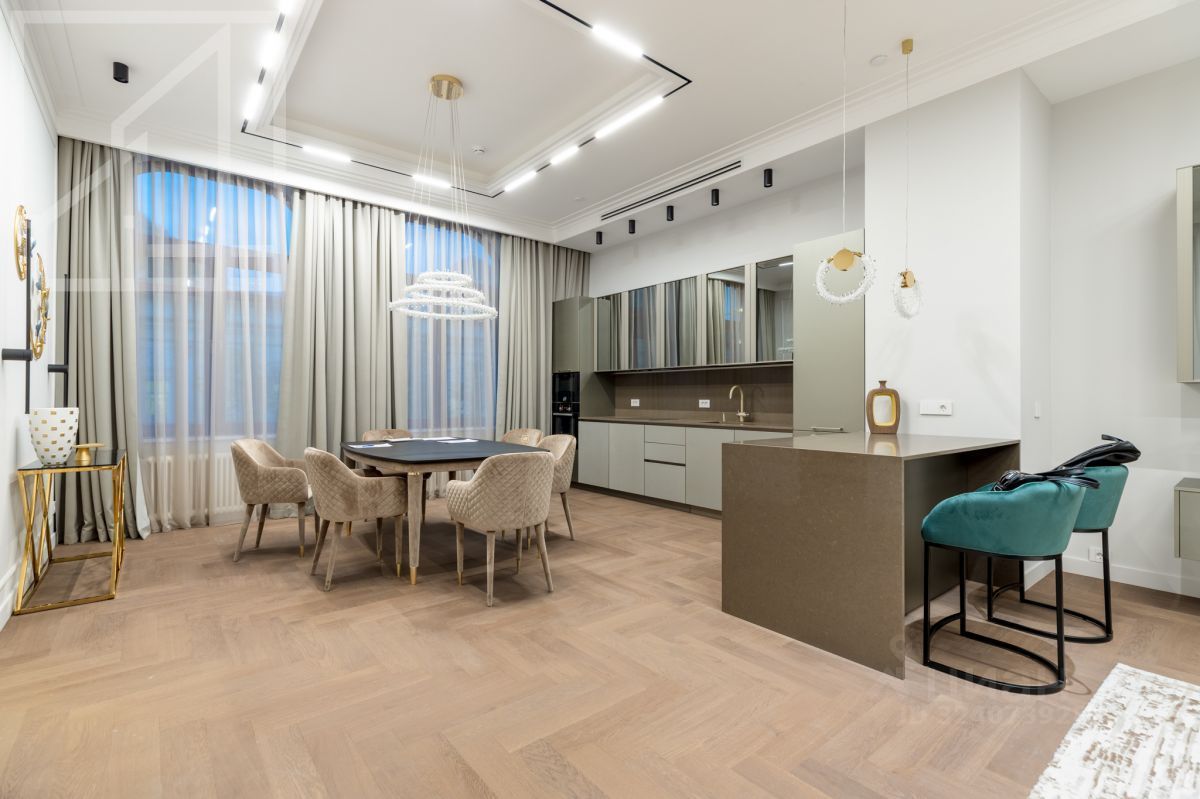 Планировка: гостиная-кухня с дровяным камином, две спальни, два совмещенных санузла, гардеробная. Окна в тихий переулок. Потолки 3.5 м. Ремонт выполнен в уникальном авторском стиле. Квартира полностью с мебелью, вывоз обсуждается. Имеется вся необходимая техника для комфортного проживания.