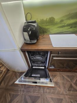 На кухне встроенная посудомоечная машина, варочная панель, духовка, микроволновка, кофемашина.