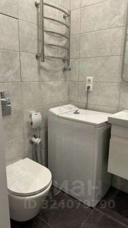 В ванной: стиральная машина, душевая зона, гигиенический душ, полотенцесушитель электрический, чистые полотенца, фен.