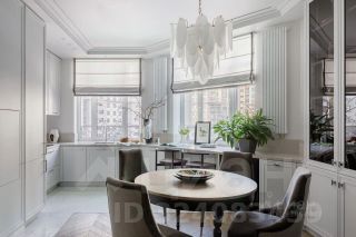 Интерьер выполнен в классическом стиле в светлых тонах с использованием натуральных материалов — дерева, паркета и тактильных текстур.