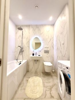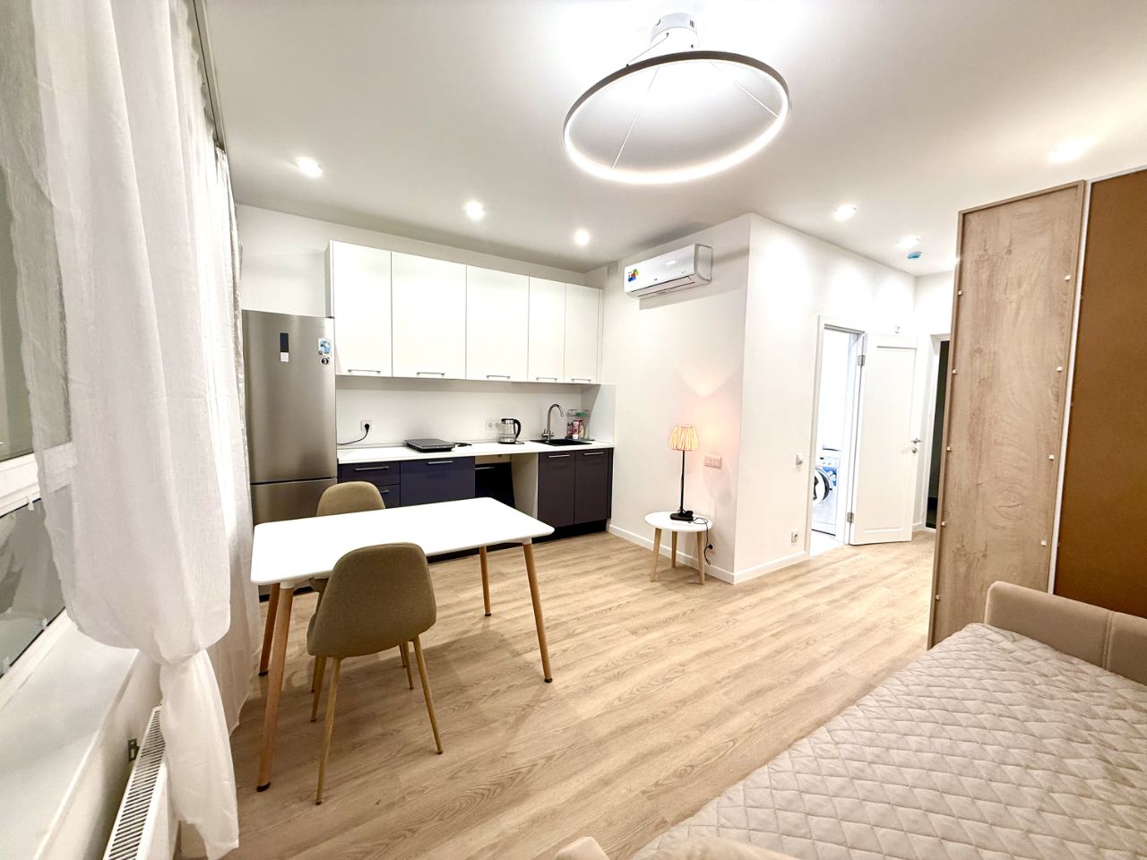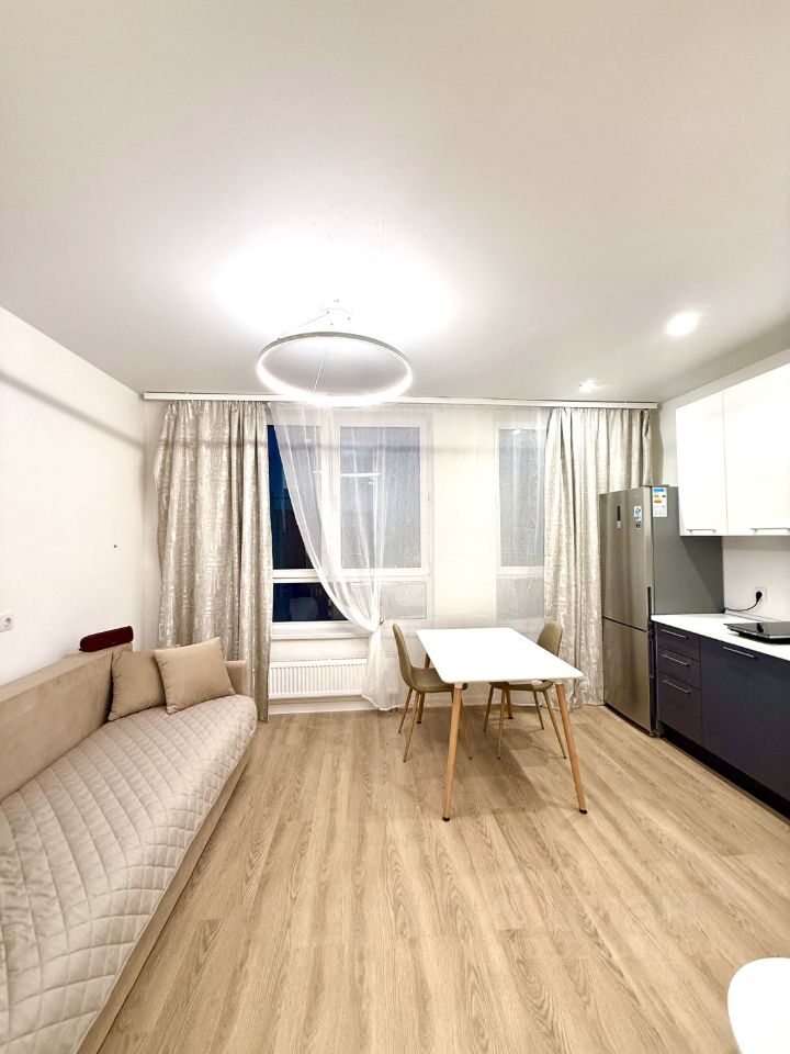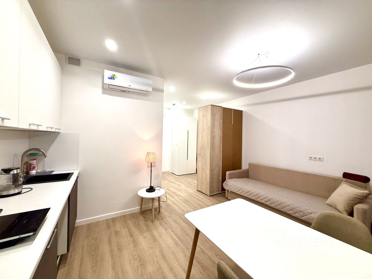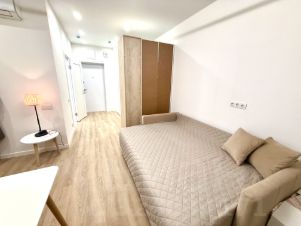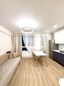 Современная входная группа, благоустроенная территория, свежий ремонт, с/у совместный оборудованный ванной, имеется кухонный гарнитур, холодильник, стиральная машинка, кондиционер, вместительный шкаф, диван-кровать 140х200. Окна ПВХ, на полу плитка, ламинат.