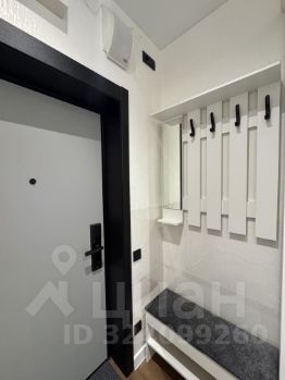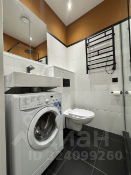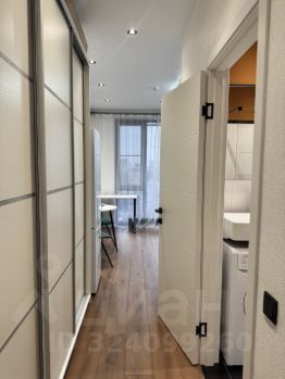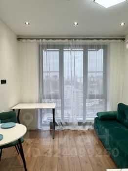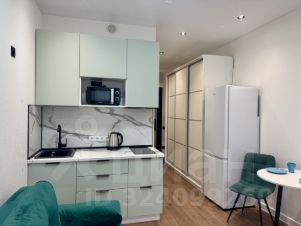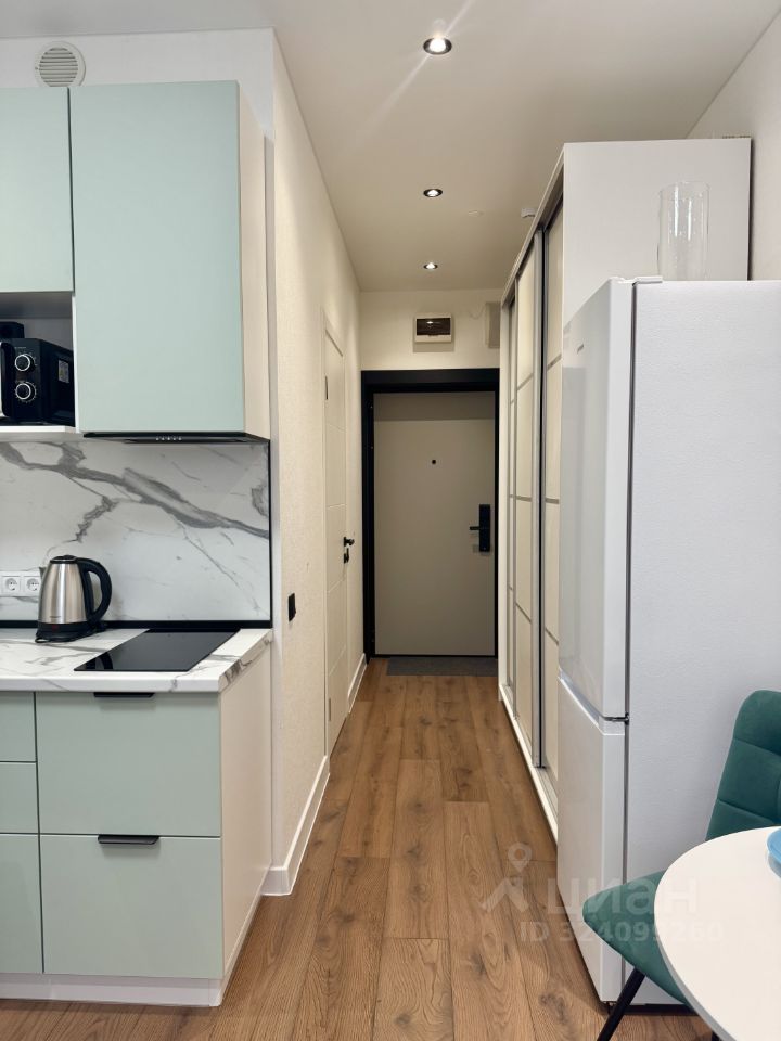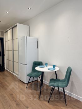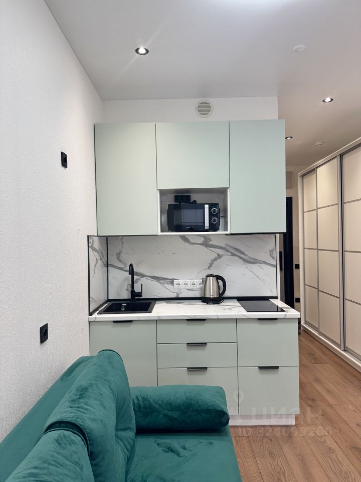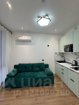 современная студия с необходимой техникой и мебелью - кондиционер, холодильник, микроволновая печь, варочная панель, стиральная машина, вытяжка, чайник, посуда, столовые приборы. Качественный диван с ортопедическим матрасом средней жестокости , большой вместительный шкаф, письменный стол и обеденный стол со стульями.