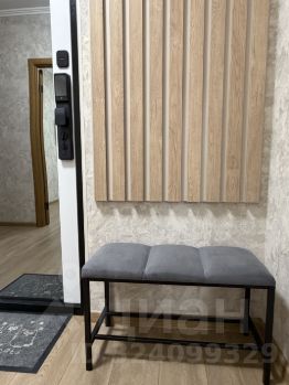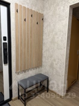 В прихожей установлены декоративные рейки с вешалками. Под рейками — мягкая банкетка для удобного обувания. Зеркало в полный рост у входа.