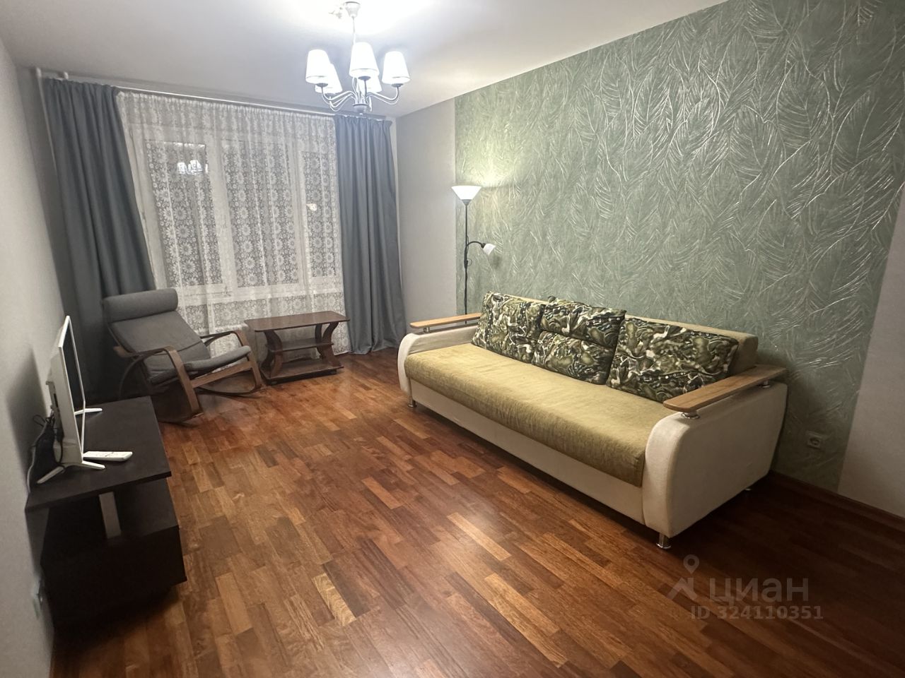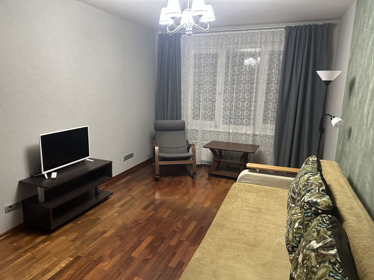 В спальне большая удобная кровать 160*200см, тумбочки. В гостиной раскладной диван (в разобранном виде 160*200), шкаф-купе во всю стену глубиной 60см, кресло-качалка, журнальный стол, тумбочка с тв. Не захламленна мебелью.