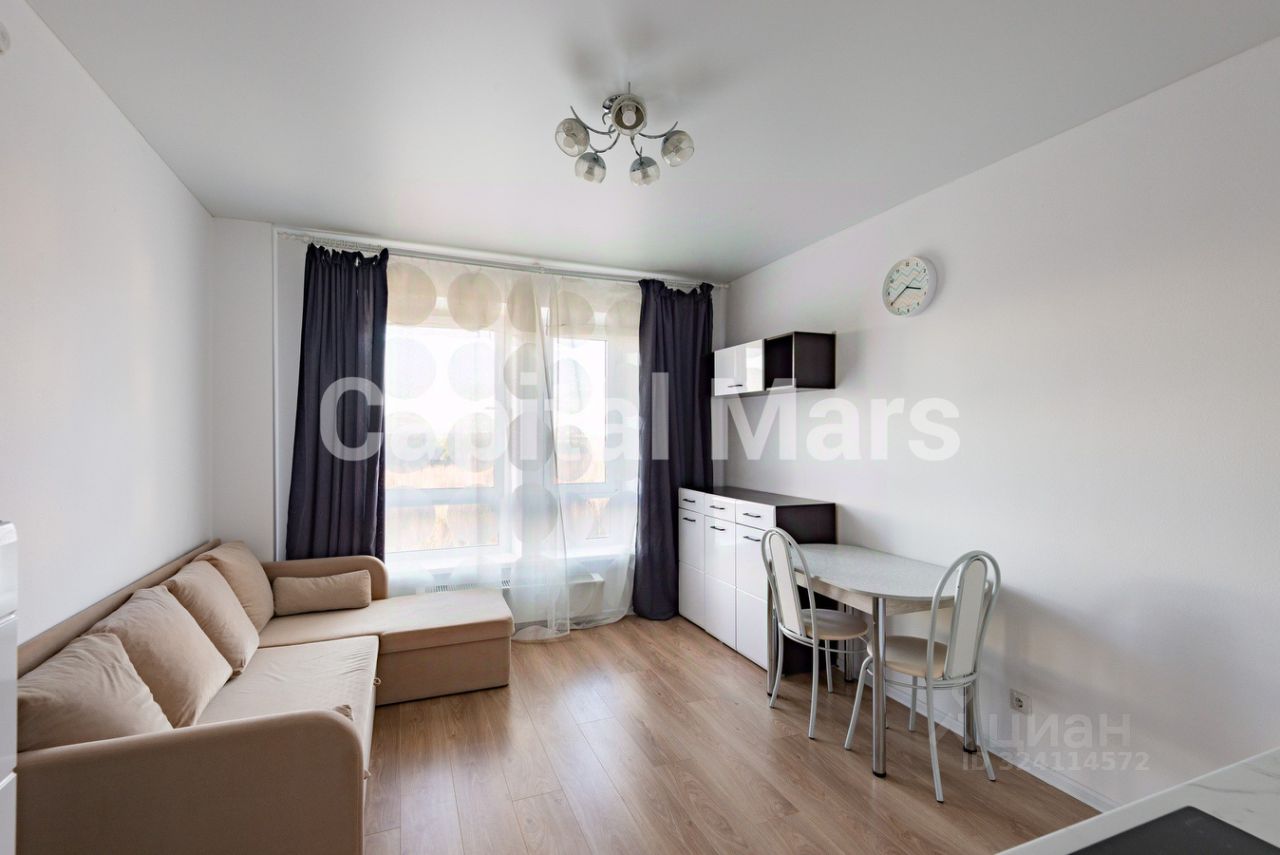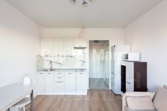 Предлагается светлая студия в новом ЖК "Саларьево парк", рядом с метро "Филатов луг". Комната располагает удобным диваном и системами хранения. В зоне кухни - обеденная группа и лаконичный гарнитур с необходимой бытовой техникой, в том числе варочной панелью и СВЧ-печью. В ванной установлен нагреватель воды.
