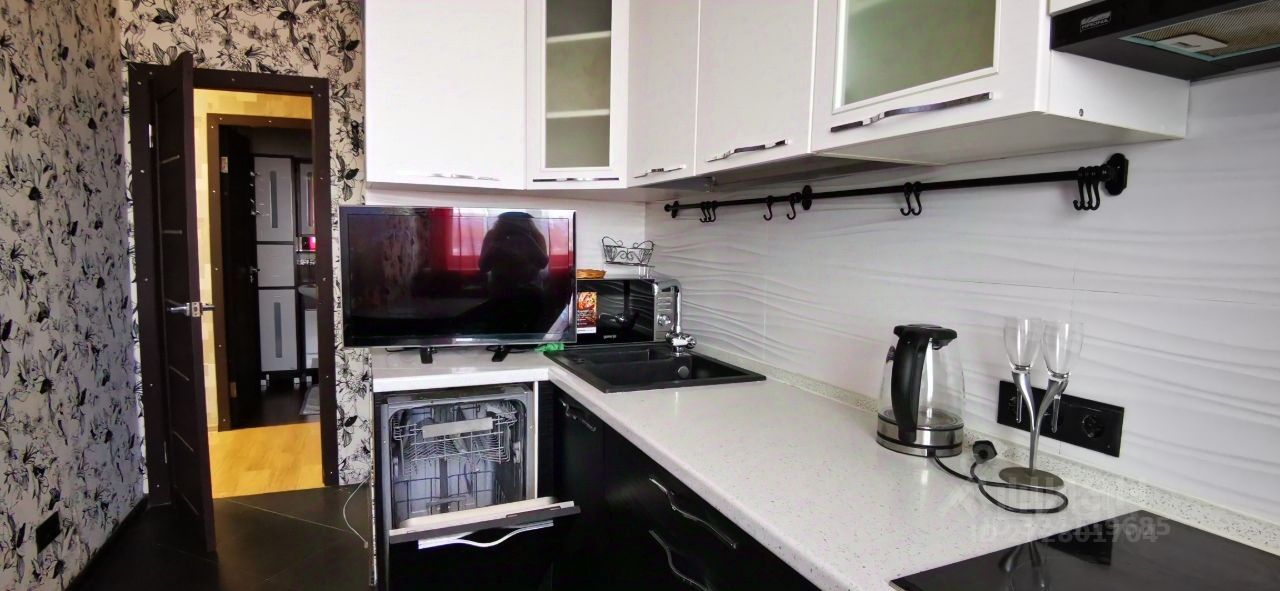 В детской комнате двухуровневая детская кровать на 2 спальных места, полочки, телевизор. На кухне посудомоечная машинка, духовой шкаф и варочная панель, холодильник, стол, 4 стула, чайник.