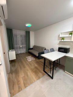 Новая квартира в новом доме (застройщик Пик). Первая сдача. Вайфай 699₽ в месяц, счетчики вода и свет оплачиваются отдельно (интернет тоже). Есть микроволновка, аэрогриль, в раковине на кухне гибкий смеситель, плита индукция (нужна специальная посуда), есть сушилка для посуды и отдельная для приборов, вытяжка со светом.