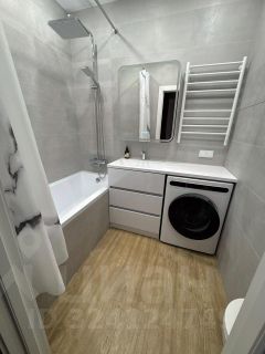 В квартире сделан дизайнерский ремонт, что создаёт атмосферу уюта и современного стиля. Комнаты полностью меблированы, а на кухне есть всё необходимое для комфортного проживания. В квартире установлены кондиционер, холодильник, посудомоечная и стиральная машины, а также телевизор. Санузел совмещённый и оснащён ванной. Окна выходят во двор, что обеспечивает дополнительную тишину и спокойствие. Квартира также имеет балкон, где можно насладиться свежим воздухом.