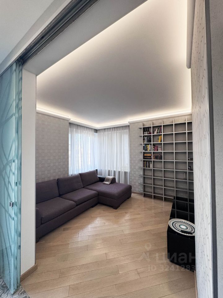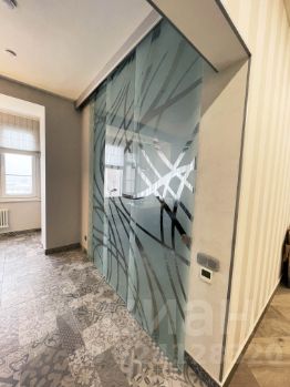 Есть стеклянная дверь / перегородка, чтобы зонировать гостиную.