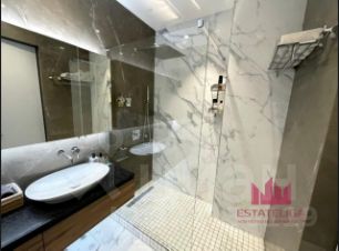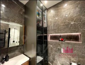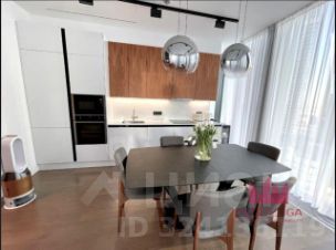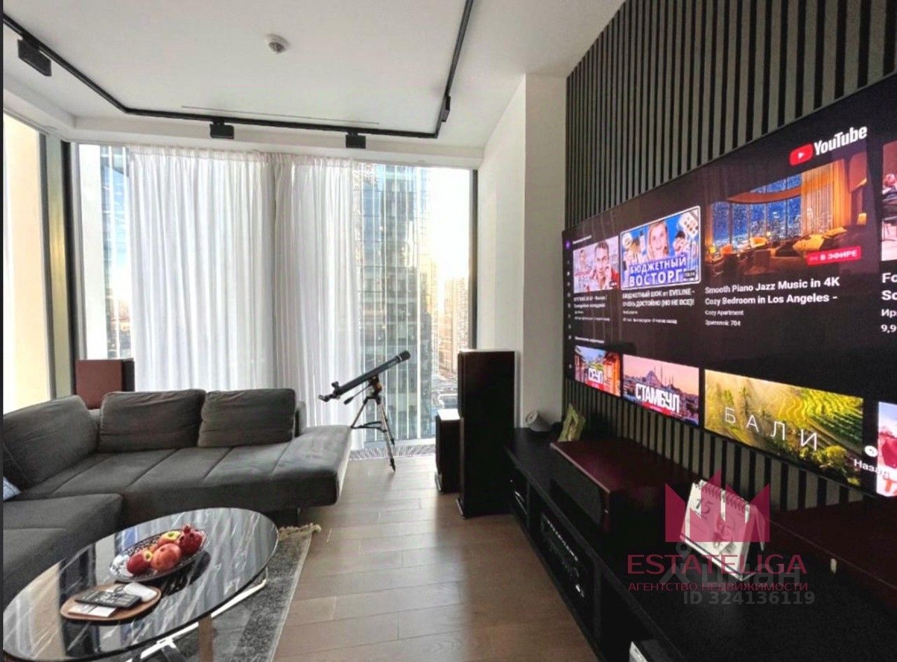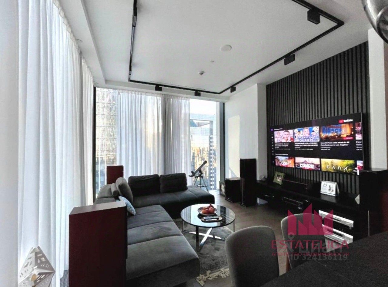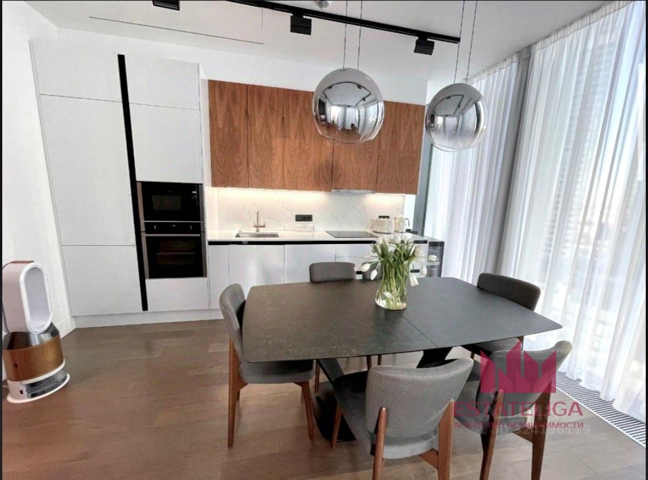 Функциональная планировка: совмещенная кухня-гостиная, отдельная спальня, кабинет, 2 санузла , холл со встроенными шкафами. Панорамное застекление по всему периметру апартаментов с видом на столицу. Винный шкаф, библиотека, подсветка.