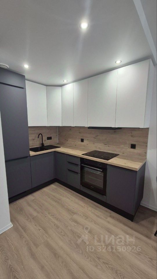 Функциональная кухня со встроенной техникой: варочная панель, духовой шкаф, встроенный холодильник, вытяжка.
