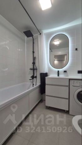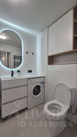 Совмещенный санузел с множеством мест хранения. Ванная комната оснащена стиральной машиной, электрическим полотенцесушителем.