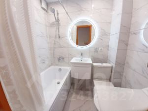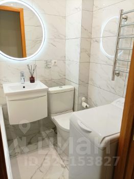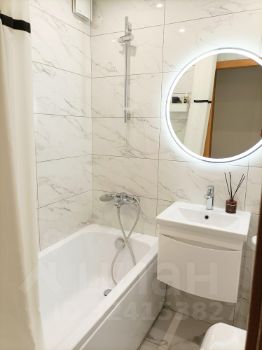 В санузле современный ремонт, ванная, зеркало с подсветкой, стиральная машина.