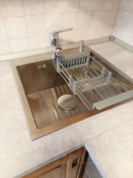 На кухне встроенный гарнитур, газовая плита с духовкой. Установлена новая посудомоечная машина, раковина, столешница.