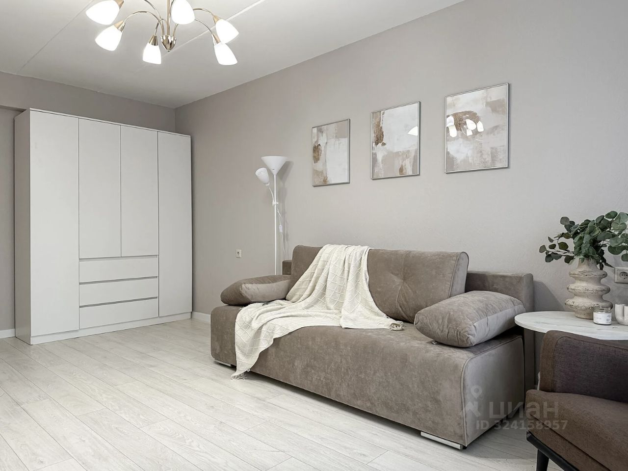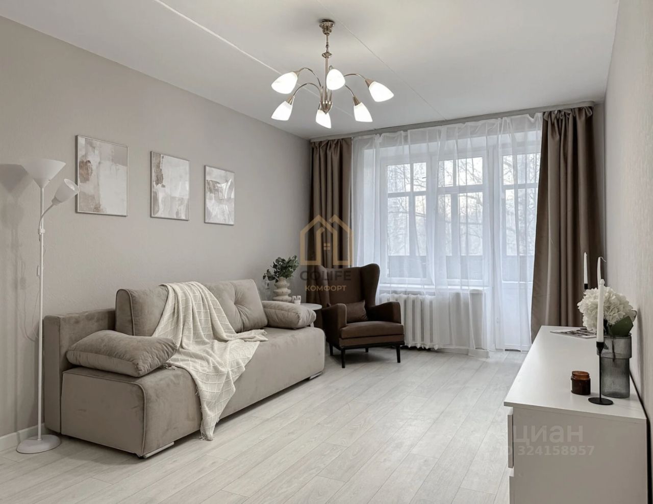 — просторную гостиную с диваном, креслом и стильным торшером — идеальное место для отдыха;