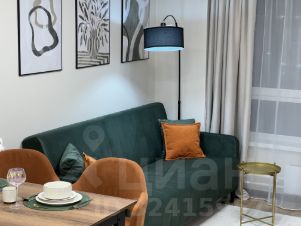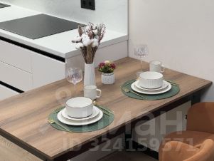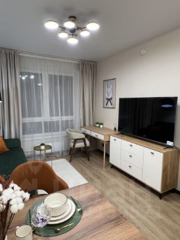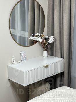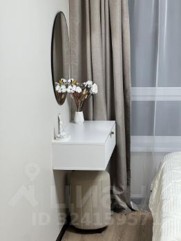 В гостиной — большой 58-дюймовый телевизор, удобный диван, который при необходимости раскладывается в полноценное спальное место, и просторные шкафы для хранения. Спальня оборудована кроватью с подъемным механизмом и ортопедическим матрасом Askona 160200, а также уютным уголком с зеркалом, подвесным столиком и мягким пуфом.
