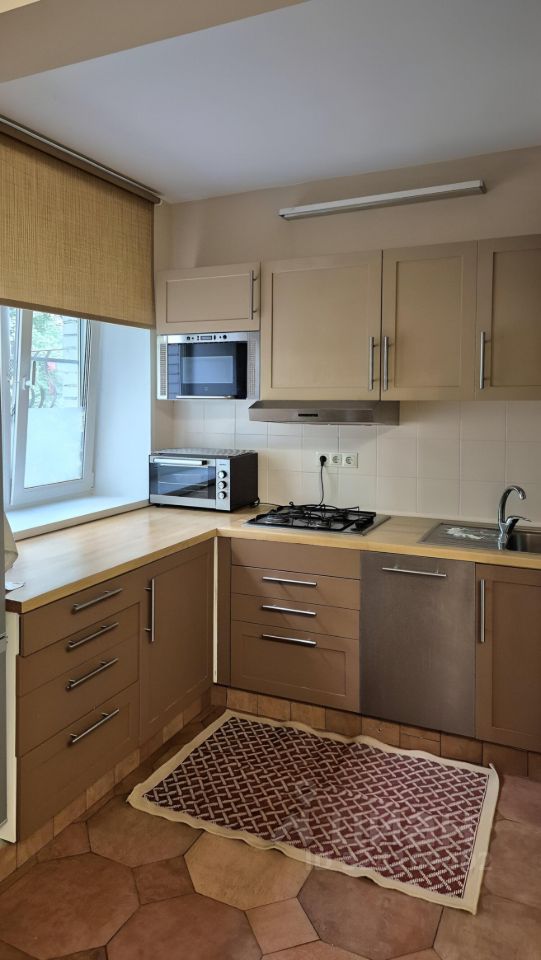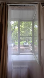 Окна квартиры выходят в тихий зелёный двор. Есть несколько детских площадок и горка для катания на станках зимой.