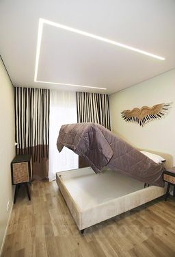 В спальне кровать с ортопедическим матрасом Askona и вместительным нижним отделением для хранения.