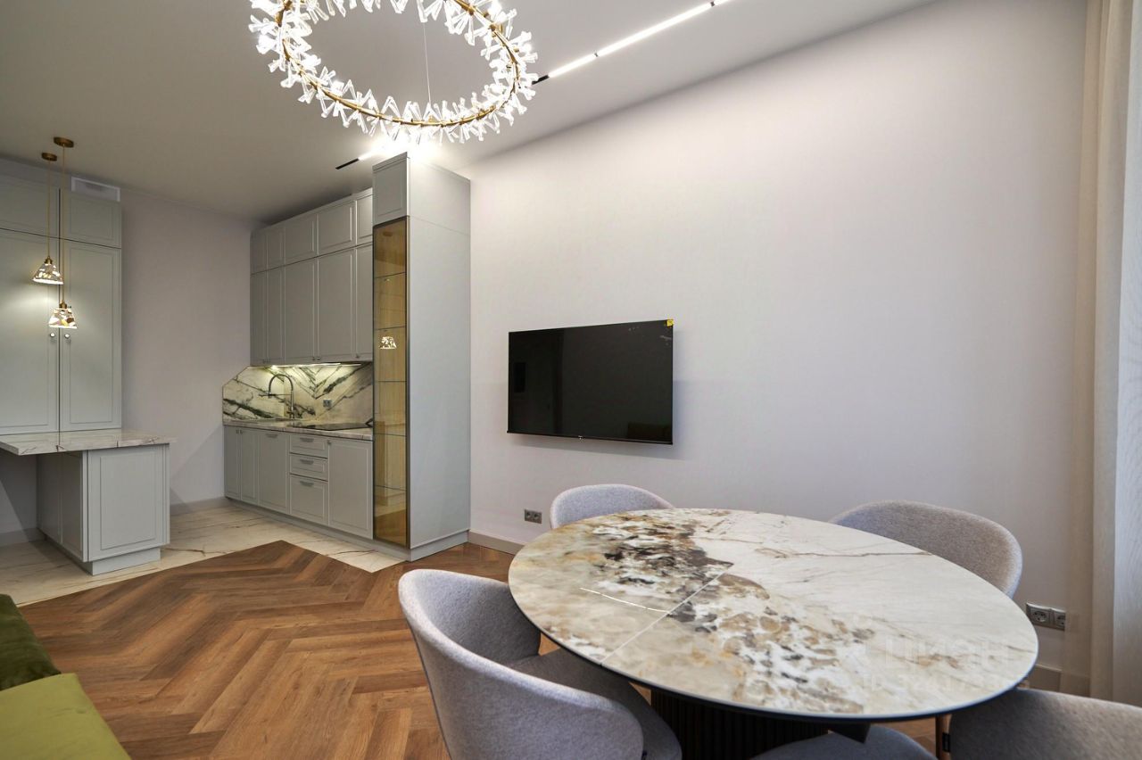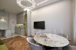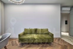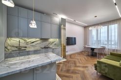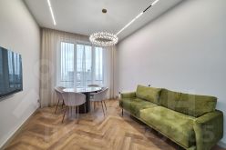 Уютная, меблирована (кроме одной комнаты) и укомплектована всей необходимой для комфортного проживания техникой: посудомоечная, стиральная и сушильная машины, варочная панель и духовой шкаф, СВЧ-печь, кондиционеры, телевизор.