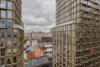 Светлая и уютная квартира с окнами на две стороны света, которая наполнена солнечным светом на протяжении всего дня. Из окон открываются виды на кирпичные здания квартала и Москва Сити.