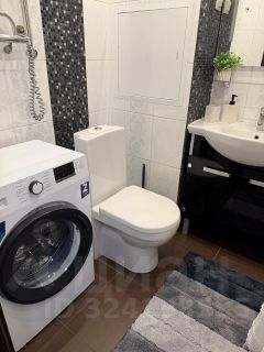 Санузел совмещённый, в ванной комнате- ванна, где можно расслабиться после рабочего дня, стиральная машина, тумбочка с раковиной и подсветкой.